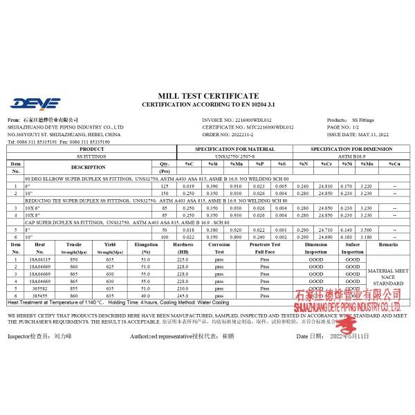 3.2 Product hardness test, For example, A234 WPB material 100% Fullfil the inspection request.